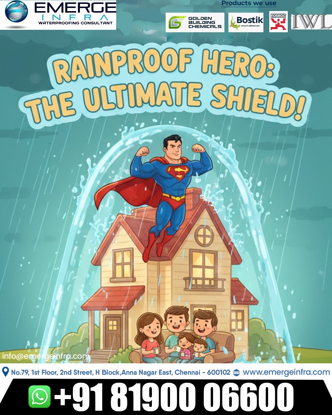 When it comes to protecting your home from rain, seepage, and dampness, you need more than just a coating — you need a shield. At Emerge Infra, we stand as your Rainproof Hero, providing the ultimate waterproofing solutions in Chennai that keep your home safe, dry, and durable all year round.