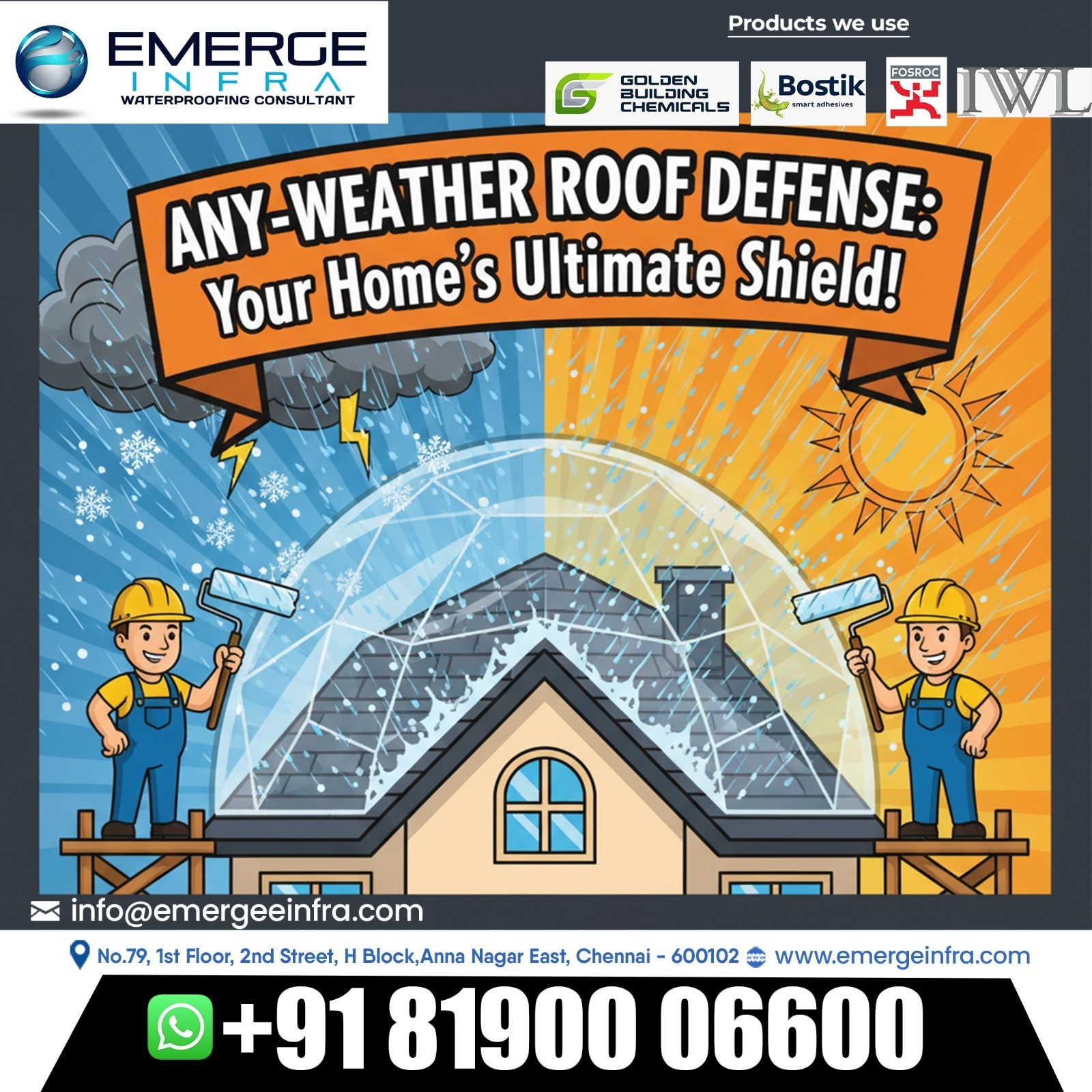 When it comes to protecting your home from unpredictable weather, Emerge Infra stands as the best waterproofing company in Chennai. Whether it’s heavy rains, scorching sun, or moisture seepage, our any-weather roof waterproofing solutions create a powerful shield that defends your home year-round. ☀️🌧️❄️