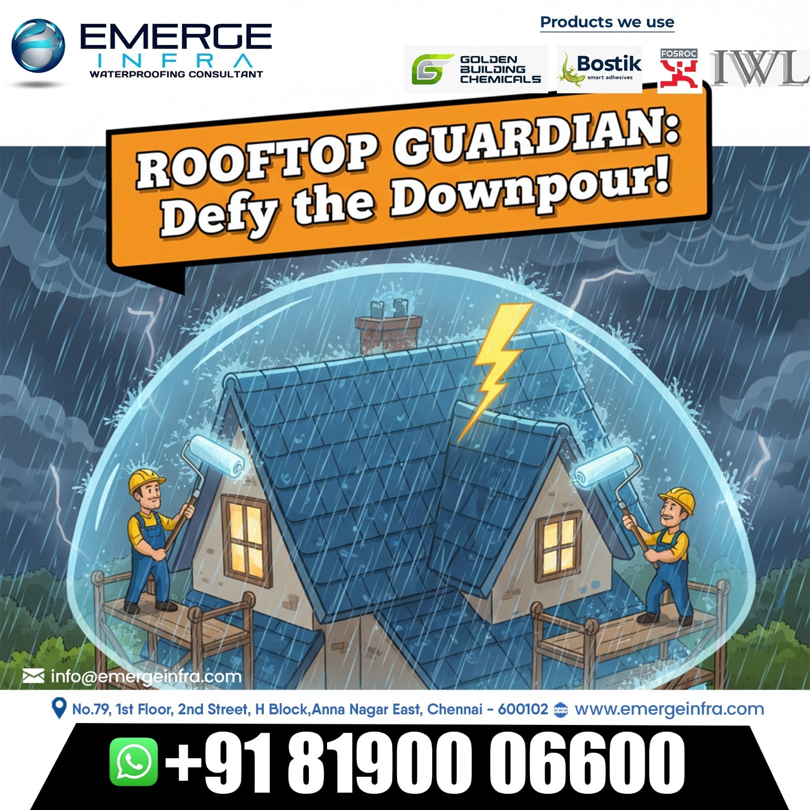 When the rain hits hard, your home deserves the ultimate protection — Emerge Infra, Chennai’s most trusted name in waterproofing solutions, is here to guard your roof, walls, and foundation against every storm. ⚡