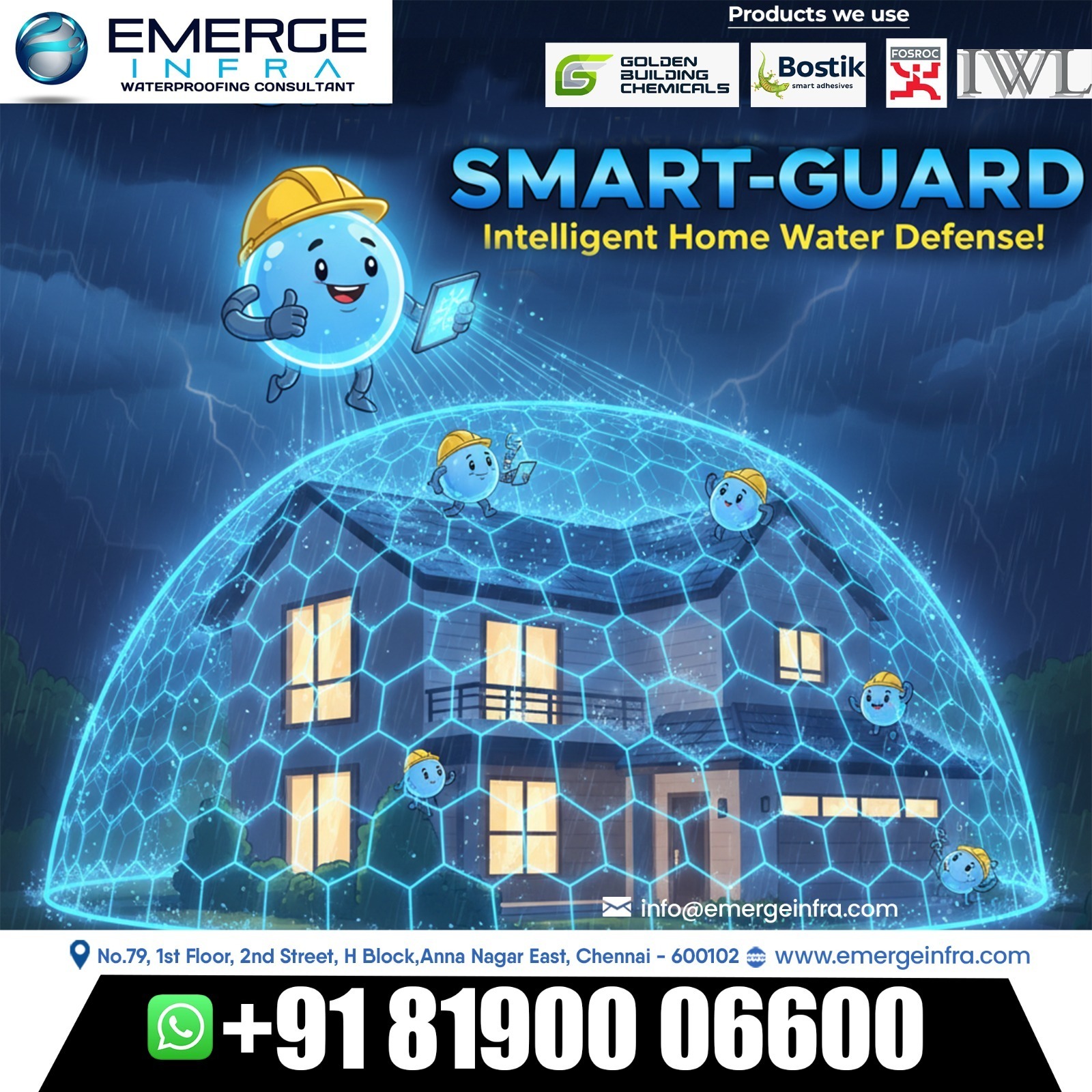 In a city like Chennai, where heavy rains and humidity are a constant challenge, protecting your home from water damage is not optional—it’s essential. Emerge Infra, Chennai’s trusted waterproofing consultant, brings you Smart-Guard – Intelligent Home Water Defense, a next-generation solution designed to keep your property safe, dry, and worry-free.