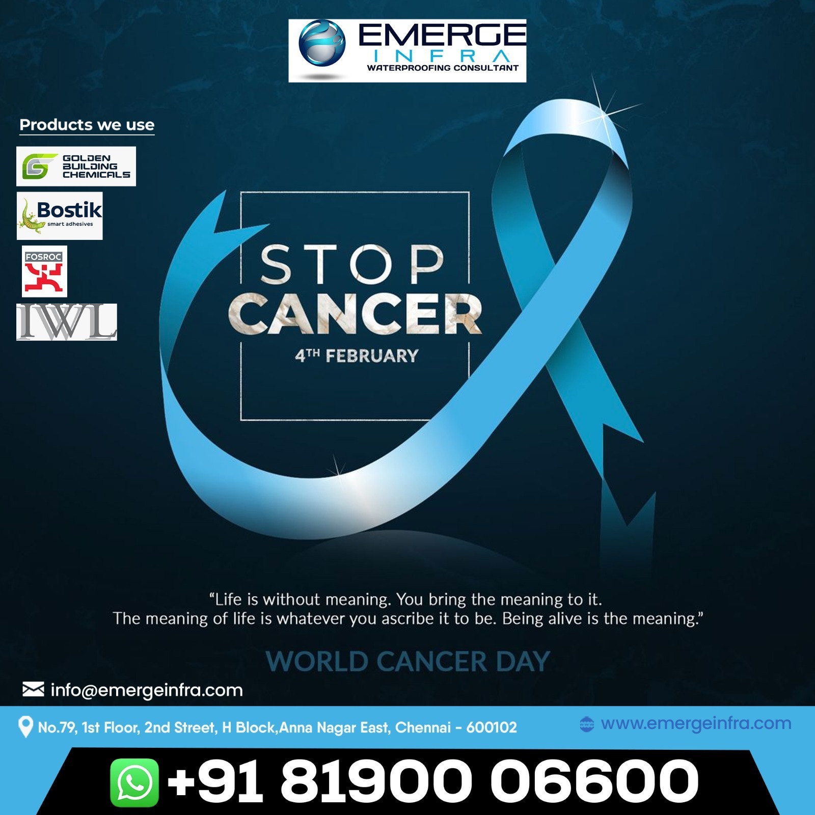 Water is essential for life—but uncontrolled water seepage can slowly damage your home, just like silent health issues can affect our lives. On this World Cancer Day (4th February), Emerge Infra – Waterproofing Consultant stands with the message “Stop Cancer” while also protecting homes and buildings from long-term structural damage through professional waterproofing solutions.