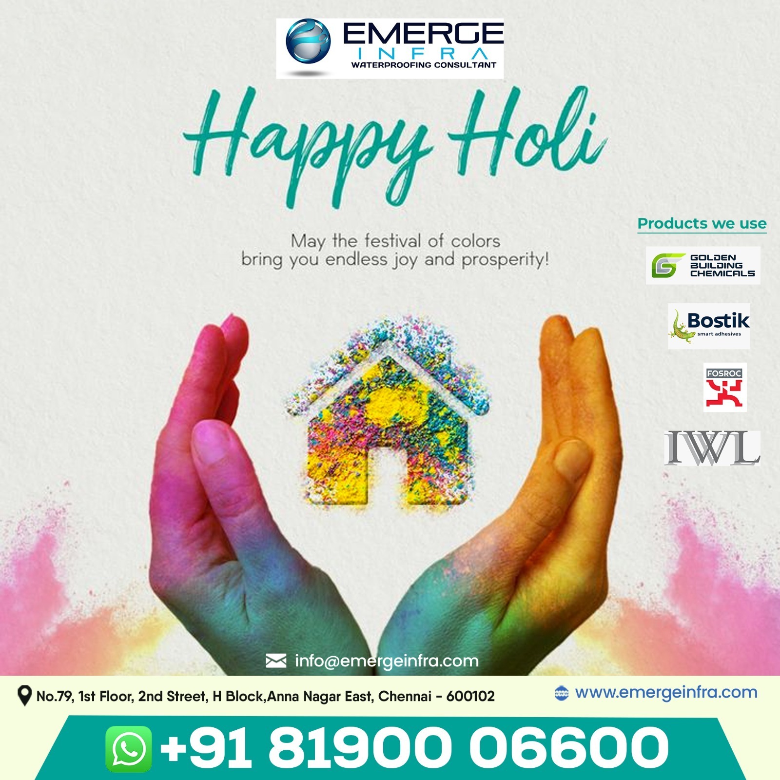 This Holi, as we celebrate colors, happiness, and new beginnings, it’s also the perfect time to protect your home from hidden damage. At Emerge Infra – Waterproofing Consultant, we wish you a joyful and prosperous festival while reminding you that a safe home starts with strong protection.