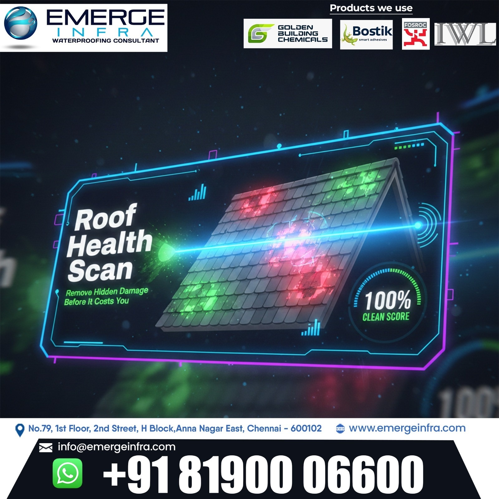 Water leakage and hidden moisture can cause serious damage to buildings if they are not detected early. That’s why choosing the Best Waterproofing Company in Chennai is essential to protect your property from long-term structural issues. At Emerge Infra – Waterproofing Consultant, we provide advanced Roof Health Scan services to identify hidden damage and deliver reliable water proofing in Chennai.