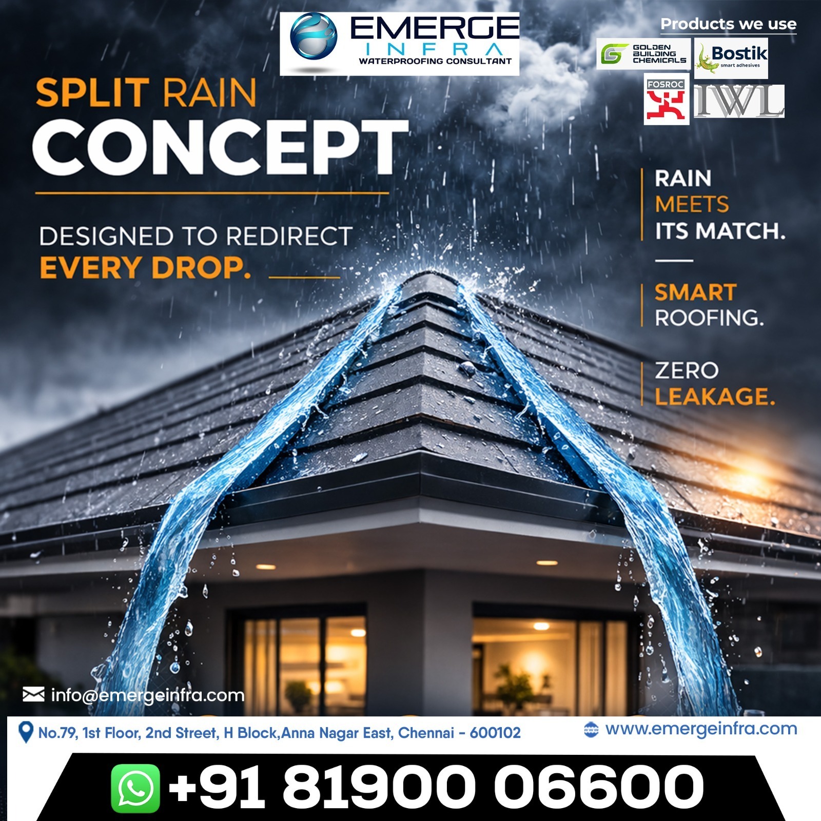 At Emerge Infra – Waterproofing Consultant, we introduce innovative waterproofing solutions like the Split Rain Concept, designed to redirect every drop of rainwater and prevent roof leakage. If you are searching for the Best Waterproofing Company in Chennai, our advanced systems ensure zero leakage and long-lasting roof protection.